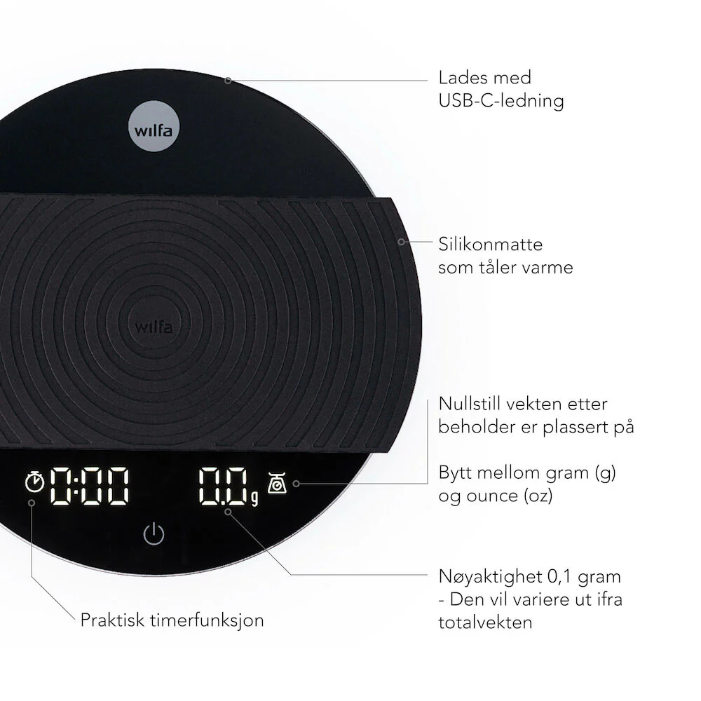 Kværnen og vægten kan forbindes til Wilfa Svart-appen via bluetooth. Appen viser dig det perfekte blandingsforhold mellem kaffe og vand helt ned til den sidste dråbe. Du finder også nyttige tips, tricks og guides til, hvordan du laver perfekt kaffe. Download app'en her: iOS og Android.